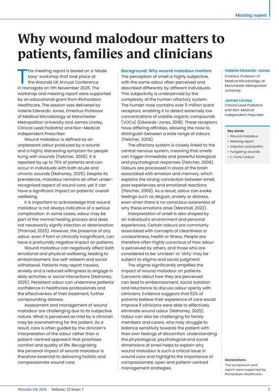 - Mahoney K (2025) Understanding wound malodour: patient and clinician perspectives. J Community Nurs 39(2): 34–8