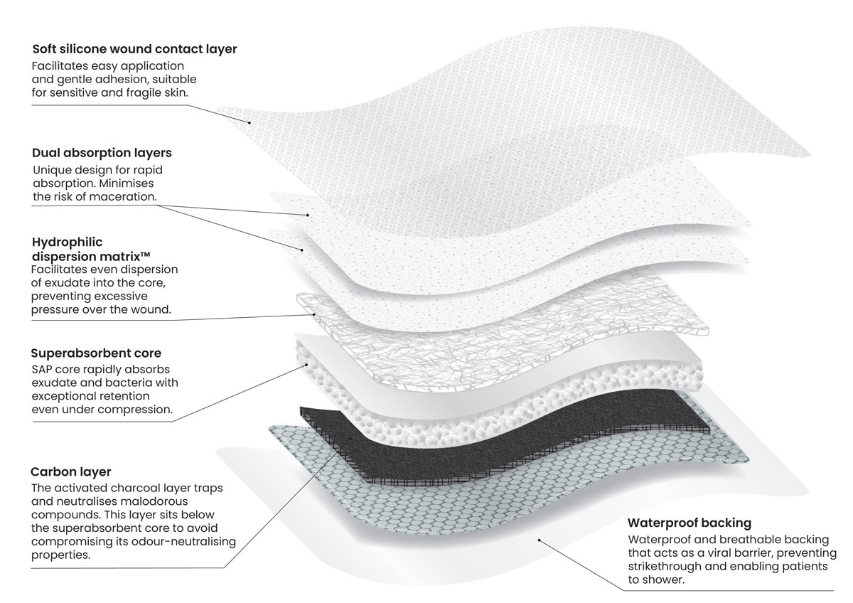 C-Sorb Carbon Border is an innovative superabsorbent dressing designed to manage these three wound care symptoms. The dressing consists of seven key features, including our high-performance superabsorbent pad, an activated charcoal layer and a gentle silicone contact layer.